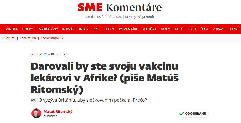 Darovali by ste svoju vakcínu lekárovi v Afrike? (SME 5.2.2021)
